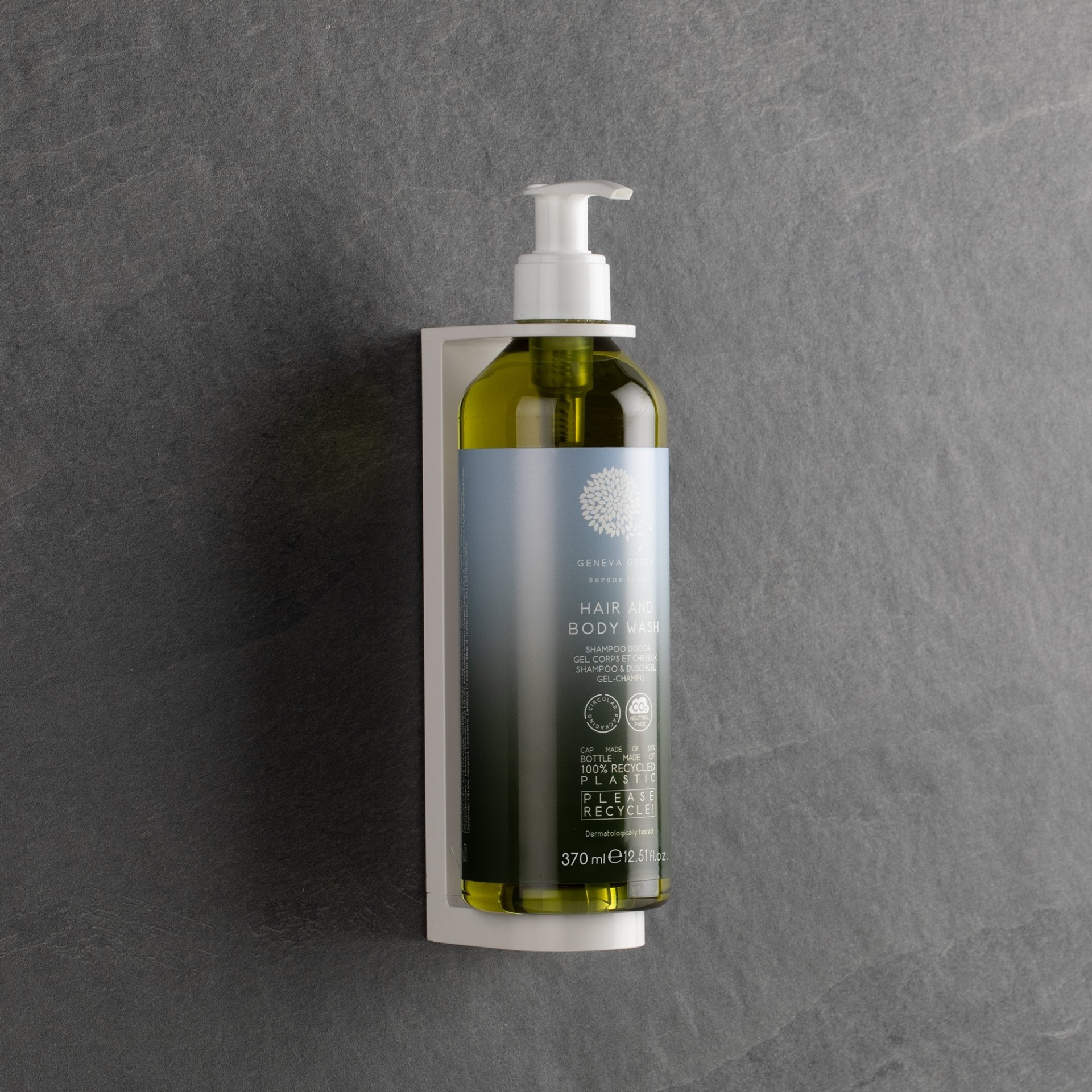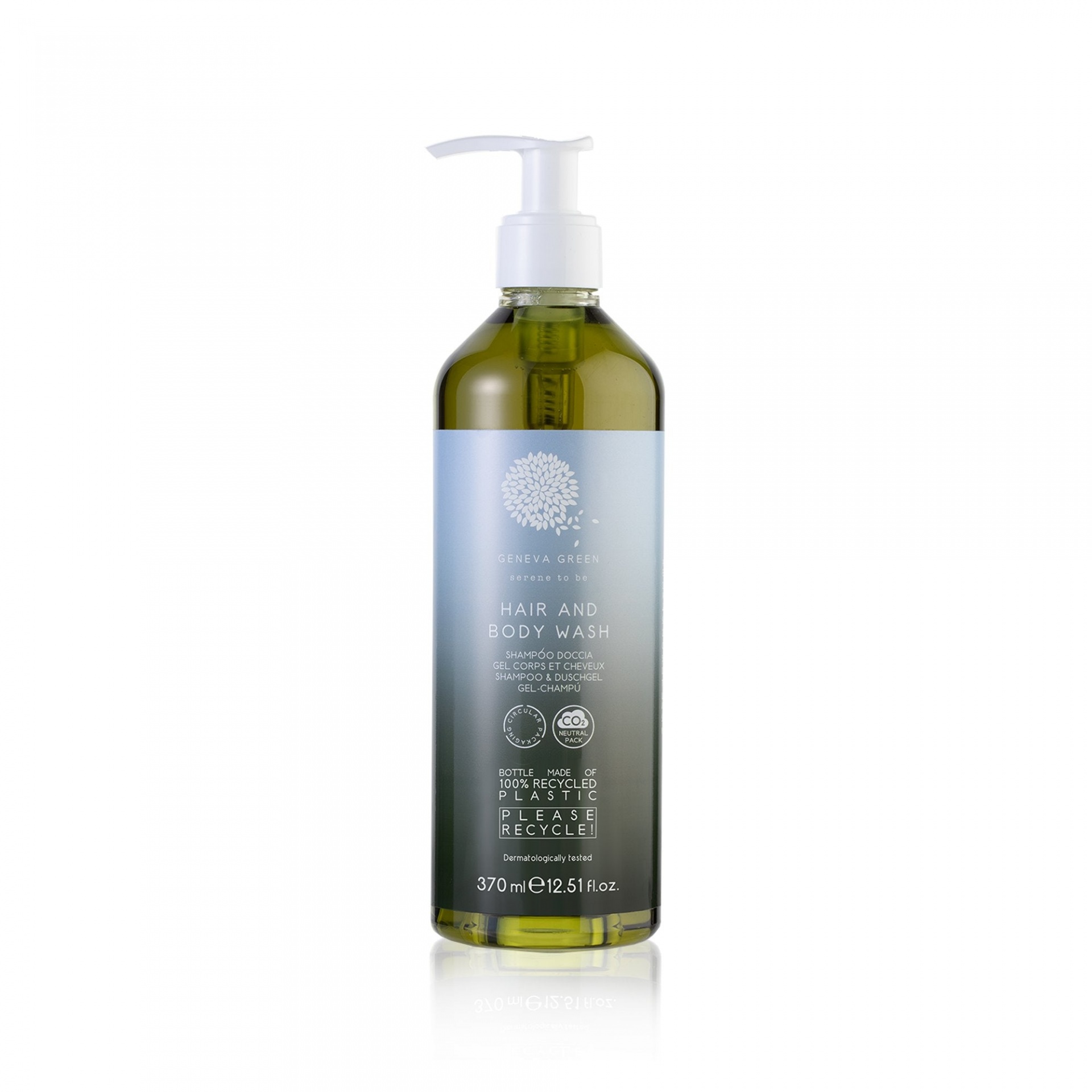 Champô e gel de banho Geneva Green enriquecido com extratos de anis verde e erva cidreira. Doseador em 100% material reciclado