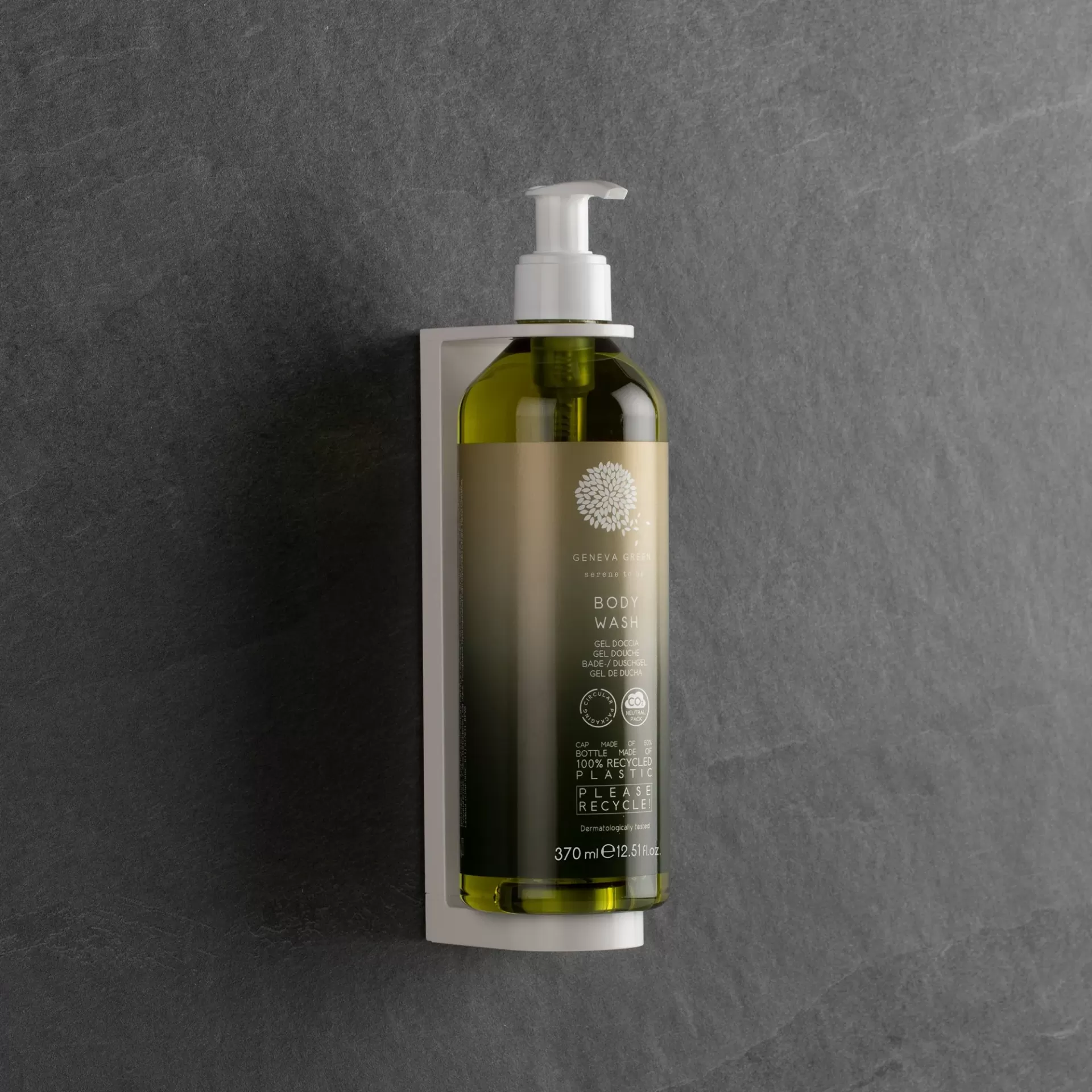 Gel de Banho Geneva Green enriquecido com extratos de anis verde e erva cidreira. Doseador em 100% material reciclado