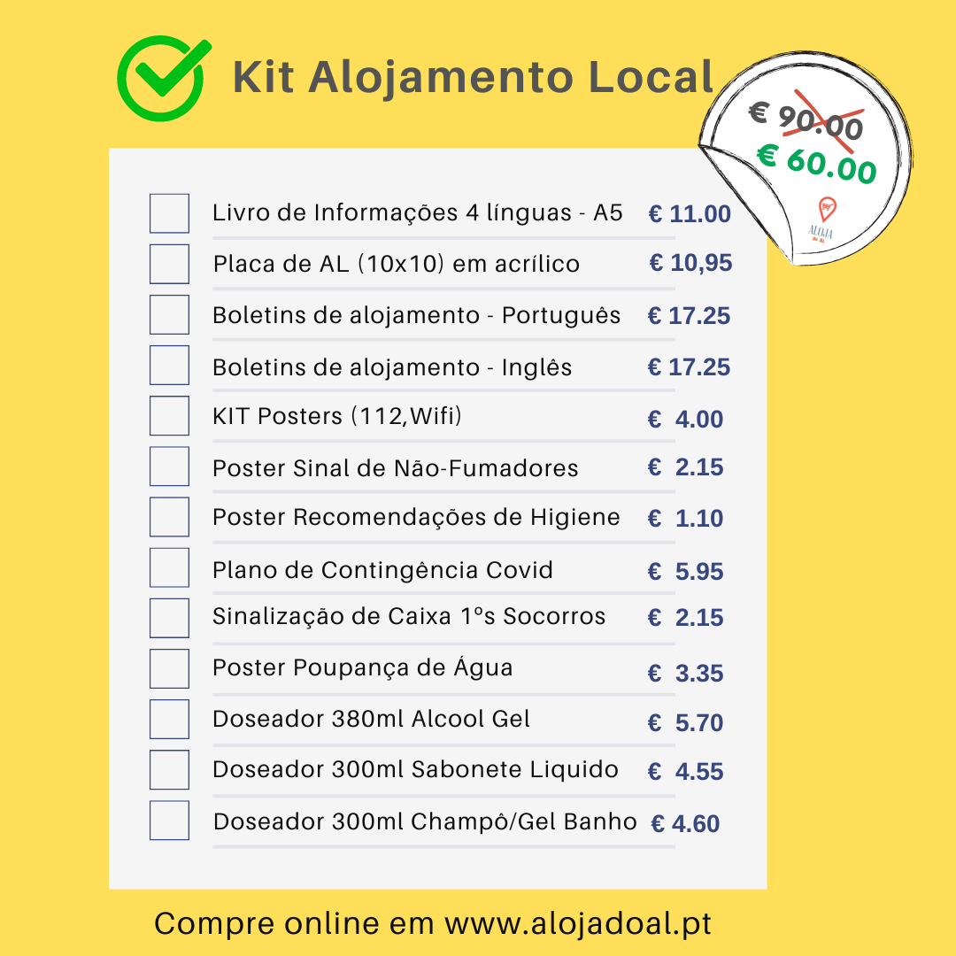 Home POSTERS Kit de material essencial para Alojamento Local Kit de material essencial para Alojamento Local 466 unidades em stock | SKU: KITESSENCIAL 60,00 € Desconto de %. IVA incluído. Comprar Contactar Adicionar à wishlist Vai iniciar-se na sua actividade e procura um kit de materiais básicos para o seu alojamento? Aproveite este kit com os essenciais para estar conforme. CADA KIT CONTÉM: 1 Livro de Informações 4 línguas 1 Placa de AL (10x10) em acrílico 100 Boletins de alojamento - Português 100 Boletins de alojamento - Inglês 1 KIT de 2 Posters (112,Wifi,) 1 Poster Recomendações de Higiene 1 Plano de Contingência Covid 1 Sinalização de Caixa 1ºs Socorros 1 Poster Sinal de Não-Fumadores 1 Poster Poupança de Água 1 Doseador 380ml Alcool Gel 1 Doseador 300ml Sabonete Liquido 1 Doseador 300ml Champô/Gel Banho Nota: materiais de segurança contra-incêndio e livro de reclamações não incluídos - deverá comprar nas entidades devidamente acreditadas. Marca ALOJADOAL Tags KITmaterial gráficoplastificaçãoPOSTERSLIVROSinternetplastificação térmicaplaca ALpersonalizávelpanfletos Partilhar