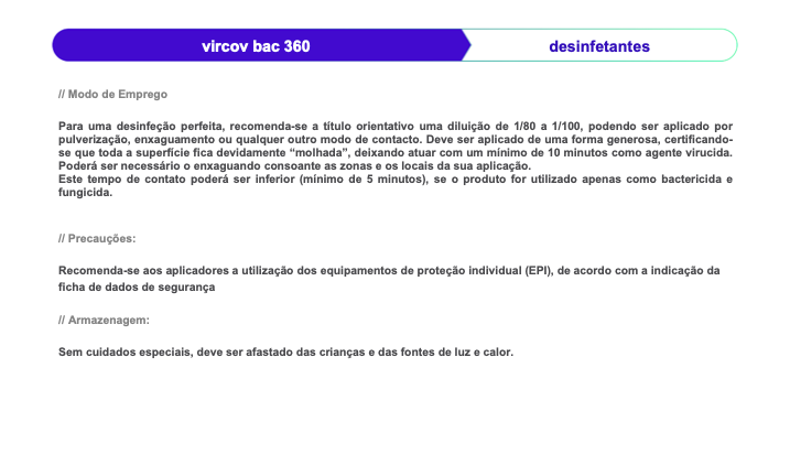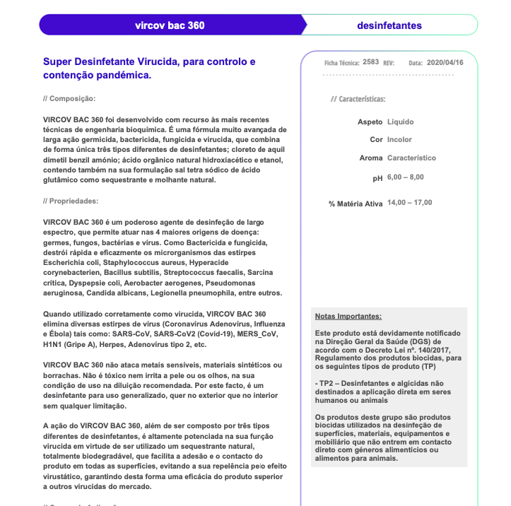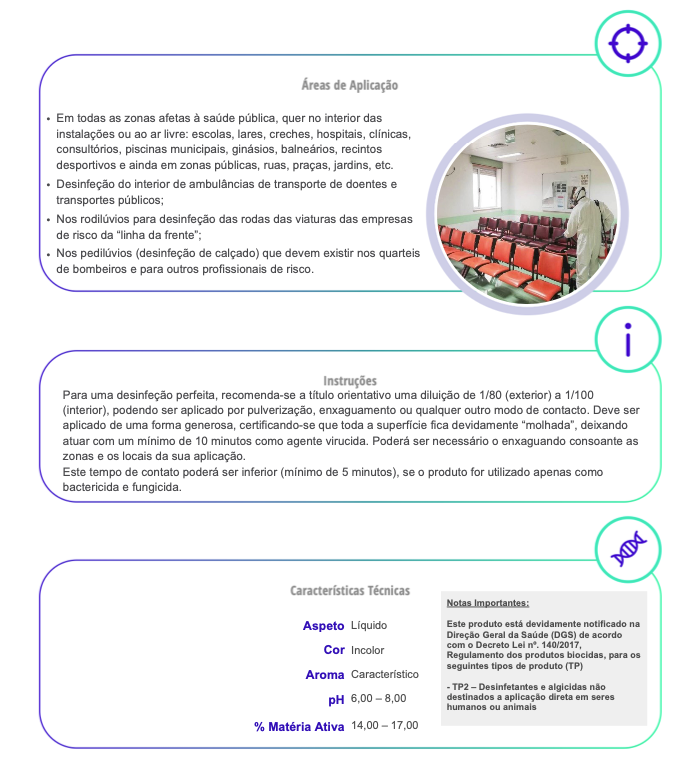 • Desinfetante para uso generalizado, com aplicabilidade no exterior quer no interior sem qualquer limitação.