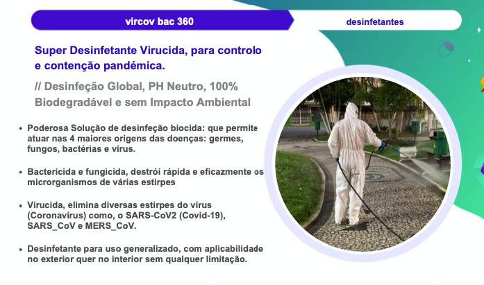 • Poderosa solução de desinfeção biocida: que permite atuar nas 4 maiores origens das doenças: germes, fungos, bactérias e vírus;